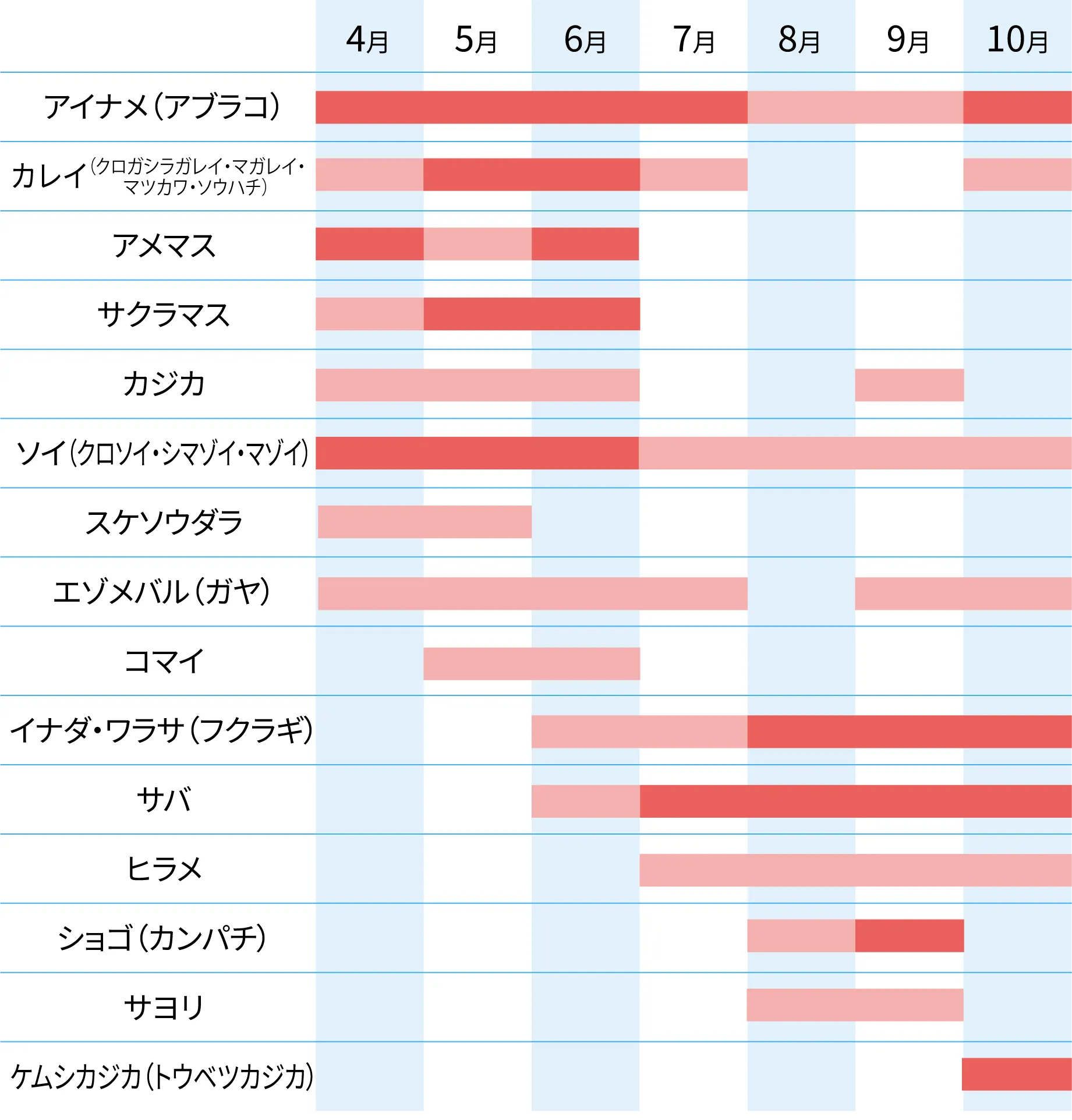 - 春・ジグやミノーの釣りでサクラマス・アメマス、ジグヘッドなどワームの釣りでアイナメ・ソイ、投げ釣りでカレイ
