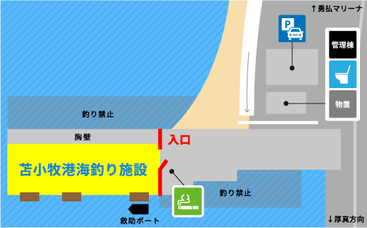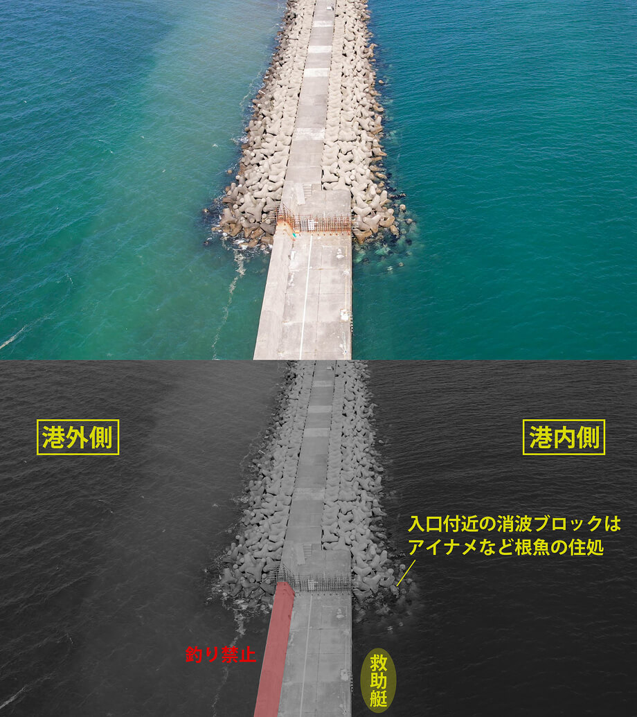 入口付近には消波ブロックがあり、アイナメ(アブラコ)など根魚の住処になっている。消波ブロックや救助艇のロープに仕掛けなどを引っ掛けないよう注意してねらってみよう。