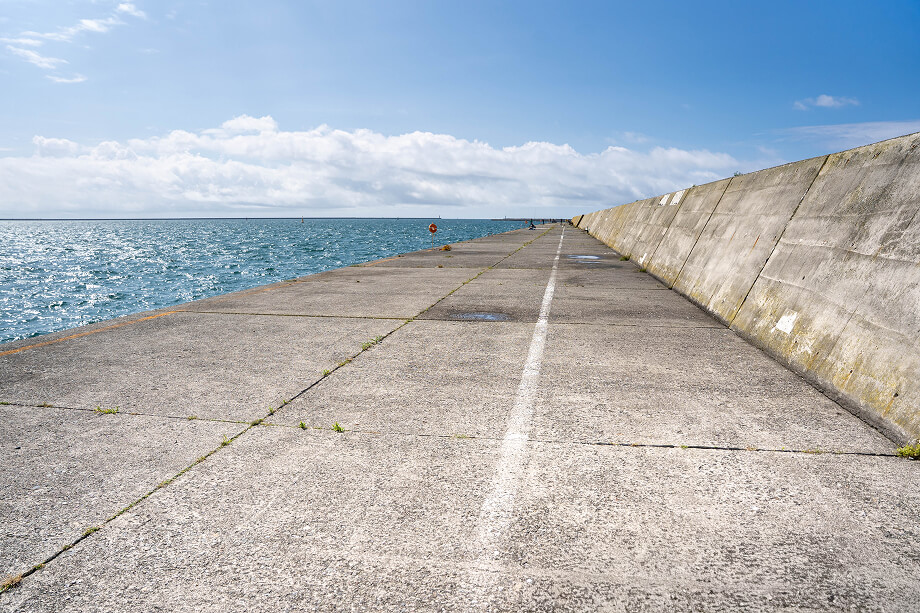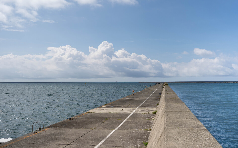 苫小牧港東港にある防波堤の一部が釣り場として整備され、入口フェンスから先端までのおよそ500m区間が開放されている。周囲の水深はおよそ8mで、海底は砂地を中心に基礎ブロックや根が点在する地形。さらにブイの先では大型船が航行するため、水深は10m前後まで落ち込む。足元にはアイナメ(アブラコ)やソイなどの根魚が定着し、沖にはサバやイナダ・ワラサ(フクラギ)といった回遊魚も姿を見せるなど、多彩な魚種を狙えるのが大きな特徴だ。