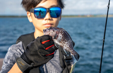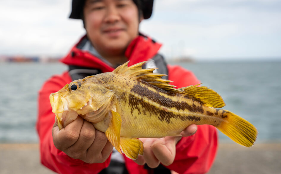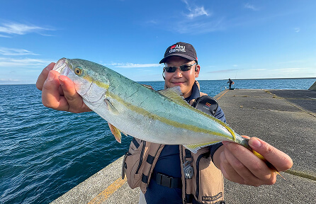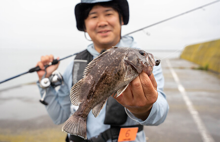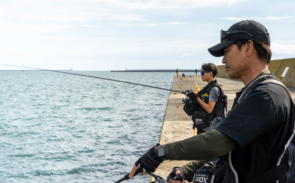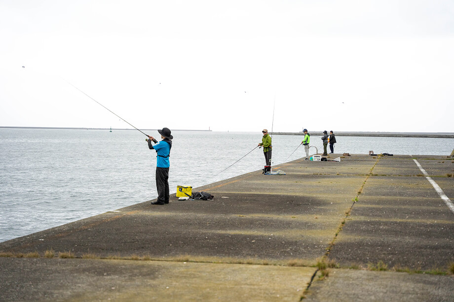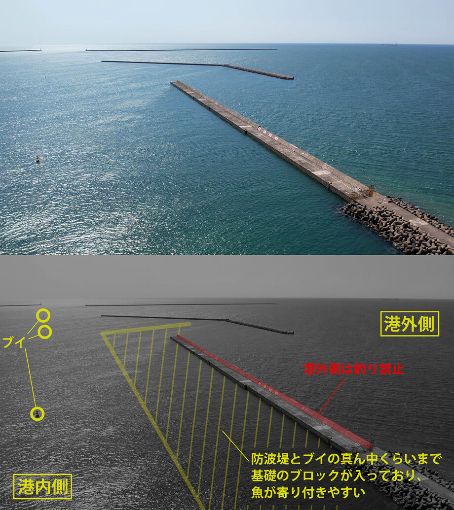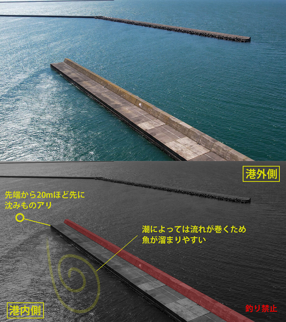 沖にあるもう1本の防波堤との間を潮が通るため、先端部では流れが巻きやすく、エサがたまりやすい環境になっている。そのためフィッシュイーターなど大物の実績が高く、釣り人にとって一番人気のポイントだ。さらに先端から約20m、45度の角度に沈む根には大型の根魚が潜んでおり、こちらもねらい目となっている。