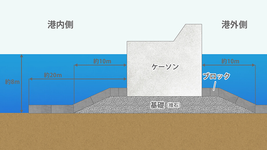 防波堤の断面図。ブロックの隙間には根魚が潜んでいる。