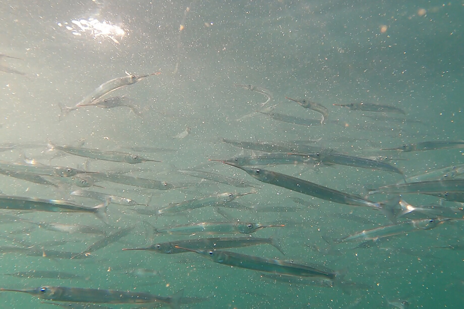 表層を回遊するサヨリはウチノ海で年中釣れるターゲットで、魚影も濃い。本格的に狙うなら浅いタナ(水深)を狙える専用の仕掛けを用意しよう。