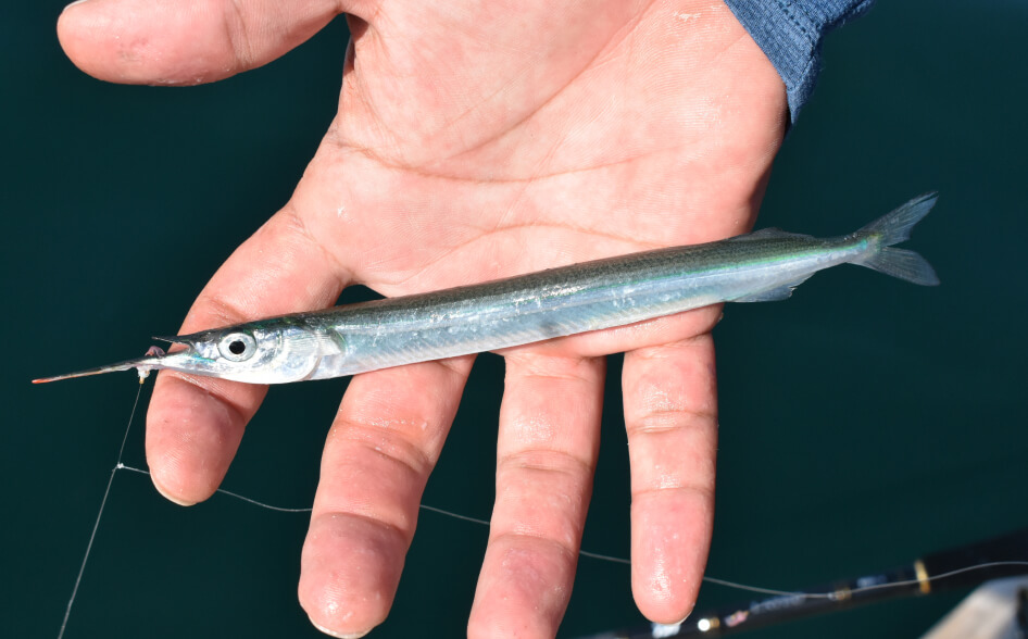 表層を回遊するサヨリはウチノ海で年中釣れるターゲットで、魚影も濃い。本格的に狙うなら浅いタナ(水深)を狙える専用の仕掛けを用意しよう。