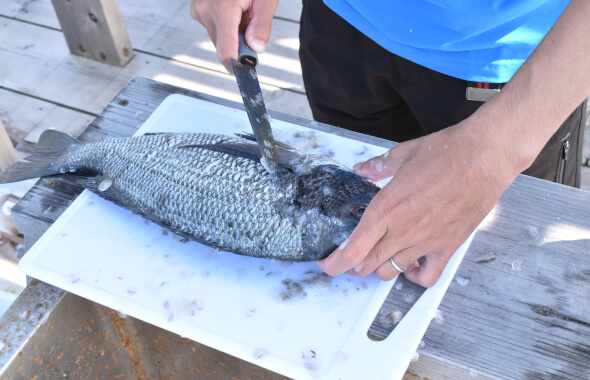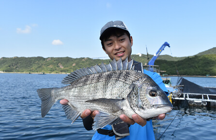 「鳴門新筏」が浮かぶ周辺の海域は、水深およそ12m。海底はフラットな砂地で、根などの障害物もほとんどない。初心者でも根掛かりを恐れることなく、快適に釣りを楽しめる。また、筏の周辺にはマダイの養殖生簀が設置されていて、そこからこぼれるエサを求め、クロダイやマダイが集まるのも特徴だ。