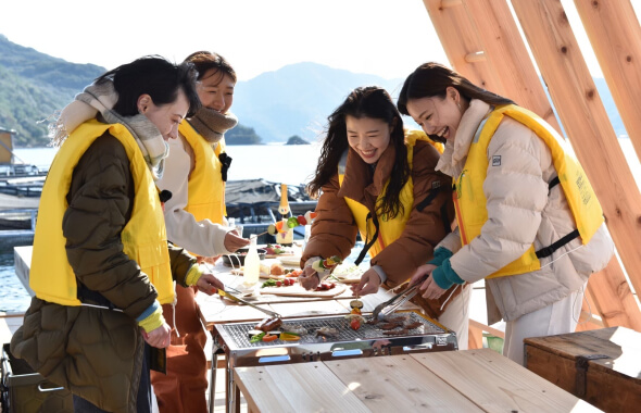 ウチノ海の筏は、渡船業者によって屋根付きのスペースやトイレといった設備が整えられている場合が多く、中にはBBQが楽しめるプランを提供する施設もある。グループ、家族連れで、ゆったりとした時間を満喫できる場所となっている。