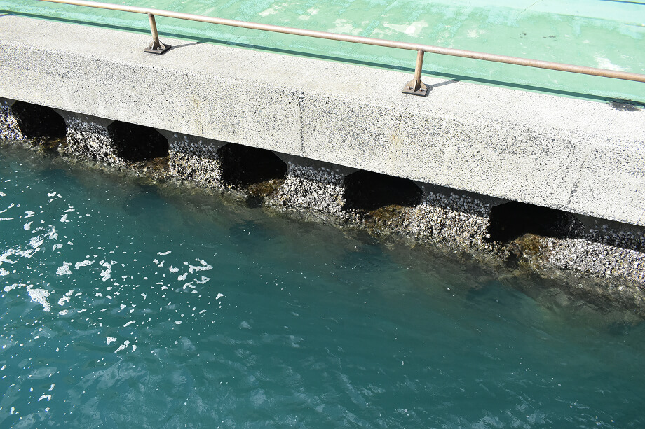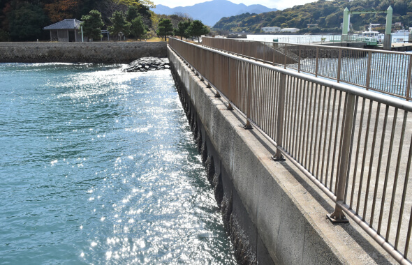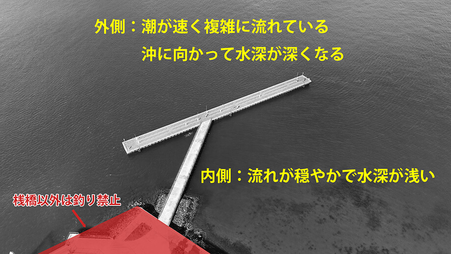 一方、内側は水深が浅く、比較的流れも緩やかで釣りやすい。高水温期にはこちらに魚が溜まることもあり、春のアオリイカねらいにも有望なポイントだ。なお、釣り桟橋以外での釣りは禁止されているので注意が必要。