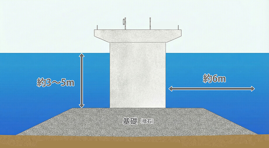 堤防足元の水深は3~5mほど。足元から6mほど沖までは「捨て石」が敷かれており、根掛かりには注意が必要だ。