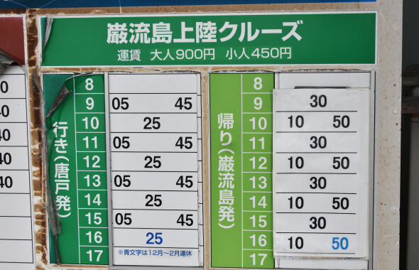 3.島に取り残されないよう、帰りの渡船運航時刻は必ず事前に確認 -
