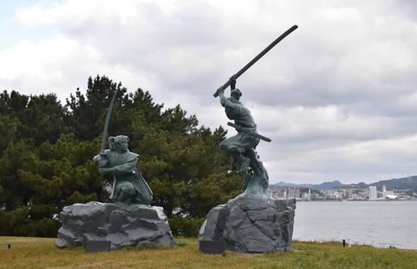 7.島内には宮本武蔵と佐々木小次郎の像もある -